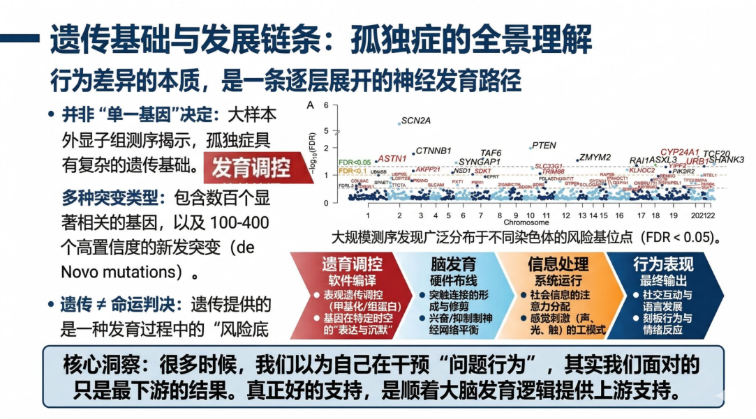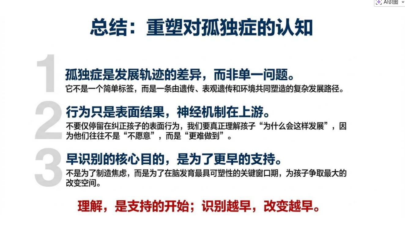 孤独症并非一个简单、单一的标签,其背后往往蕴含着复杂的生物学基础,且存在显著的个体差异。孩子的发展并不是完全被“先天”固定下来的,也正因为如此,机制研究的意义,并不只是为了回答“为什么会这样”,更重要的是帮助我们进一步思考:哪些孩子需要更早被识别,哪些干预支持方式可能更适合他们,哪些改变是真正有机会发生的……
