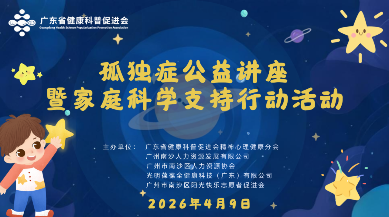 为响应第十九个世界孤独症关注日公益倡导,助力孤独症儿童“筛查—诊断—康复—教育—家庭支持—社会融入”全过程服务体系建设,2026年4月9日,“孤独症公益讲座暨家庭科学支持行动活动”,在广州南沙国际人才港5楼新闻发布厅圆满举办。此次公益活动主题为“孤独症干预新路径:从‘表观评估’到‘表观重塑’”,由广东省健康科普促进会精神心理健康分会发起,广州南沙人力资源发展有限公司、广州市南沙区人力资源协会联合光明葆葆全健康科技(广东)有限公司和广州市南沙区阳光快乐志愿者促进会主办。