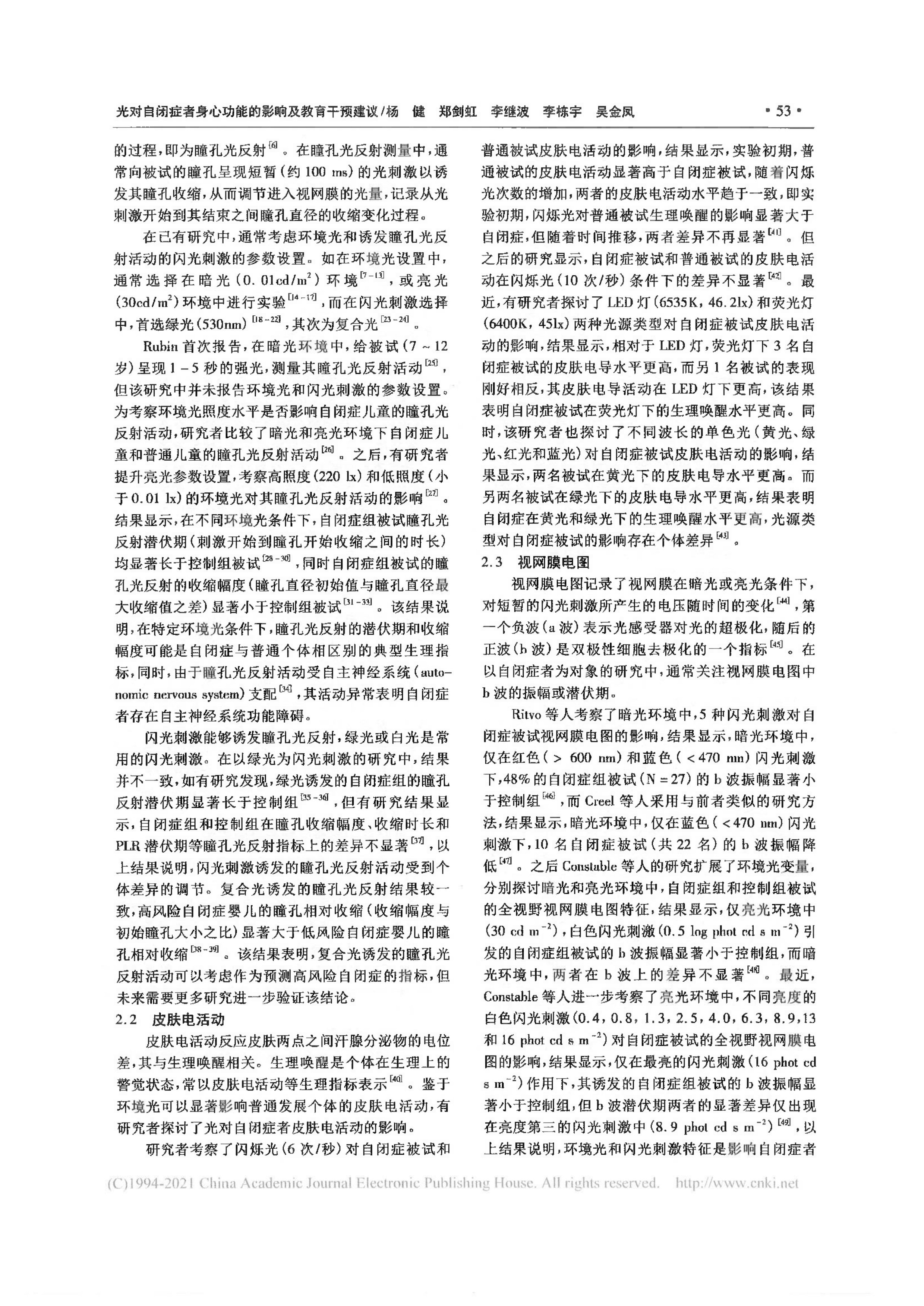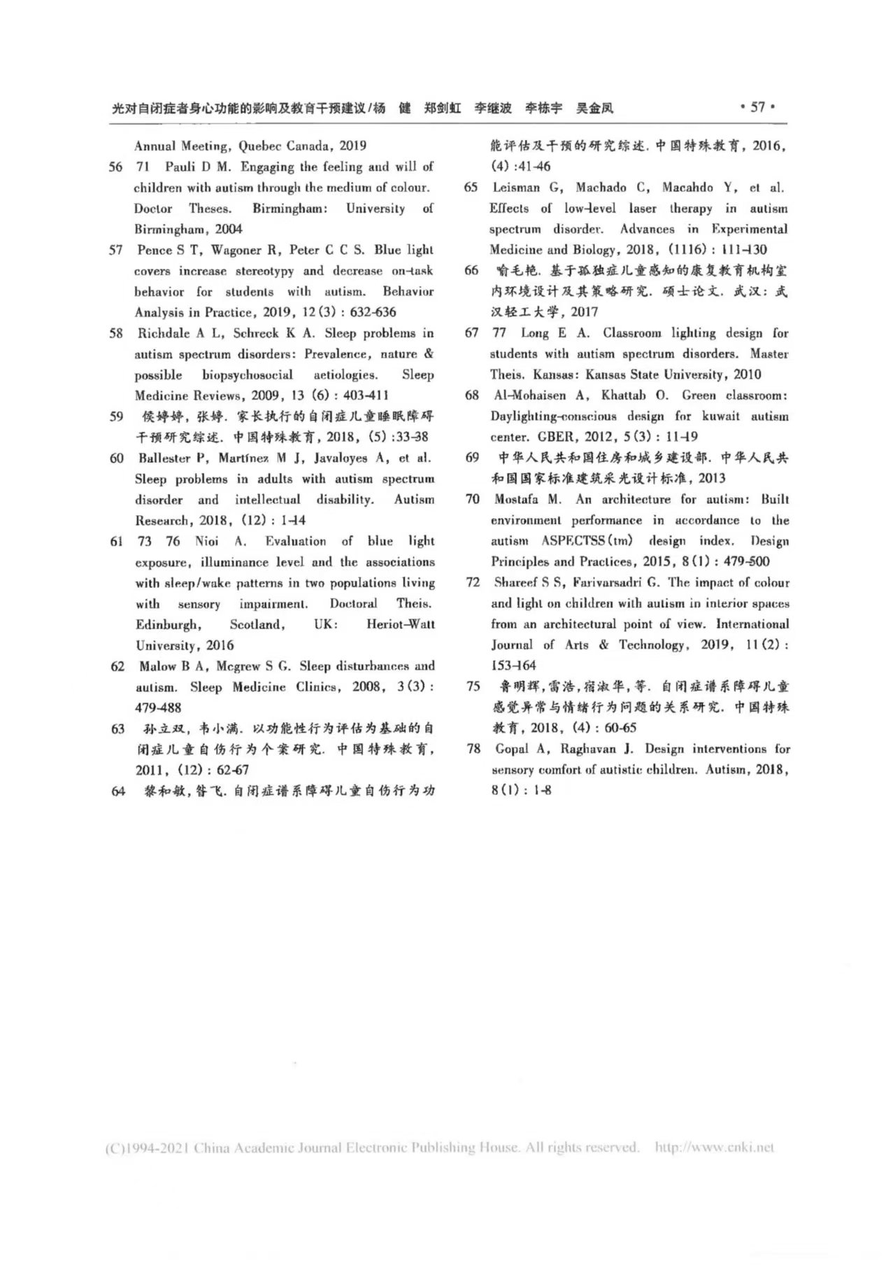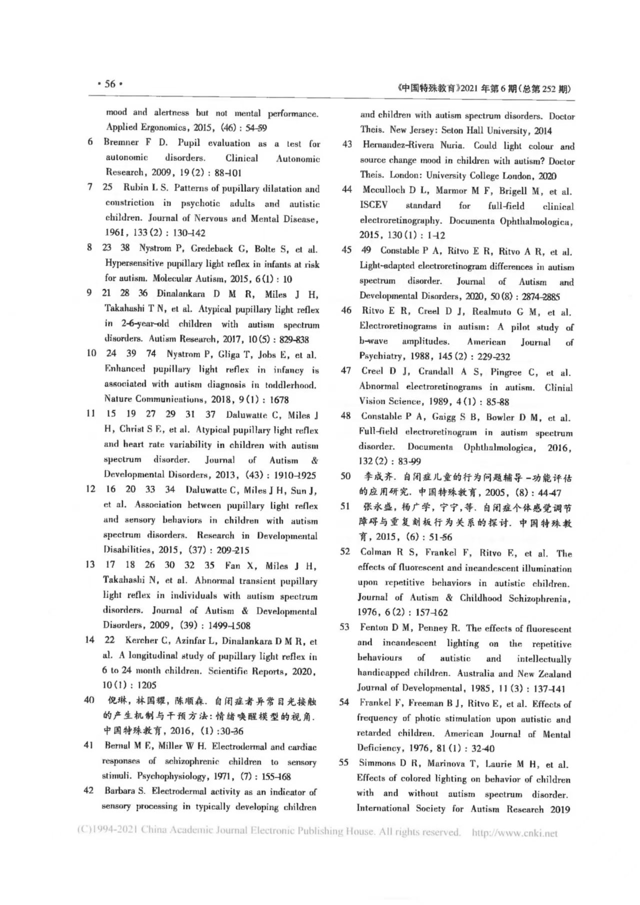 摘要:光的非视觉作用对个体身心功能的影响备受关注。在特殊教育领域中,研究者主要关注光对自闭症者生理活动和行为表现的影响。研究发现,受环境光照或闪光刺激的影响,自闭症组和对照组的被试在瞳孔光反射、皮肤电活动和视网膜电图等生理活动上存在显著差异;光对自闭症者重复刻板行为的影响尚未达成一致。但在睡眠行为上,研究者普遍发现夜间睡前短波和高照度的环境光不利于自闭症者的睡眠质量。在教育干预中,应首选自然光,且为双侧采光:其次选择白炽灯而非荧光灯,且为间接照明;卧室中应尽量避免短波丰富且高照度的灯具。未来可以从婴儿早期自闭症筛查的光参数设置,自闭症者行为表现光干预、睡眠行为光干预和个性化照明系统开发等角度进行深入研究。
