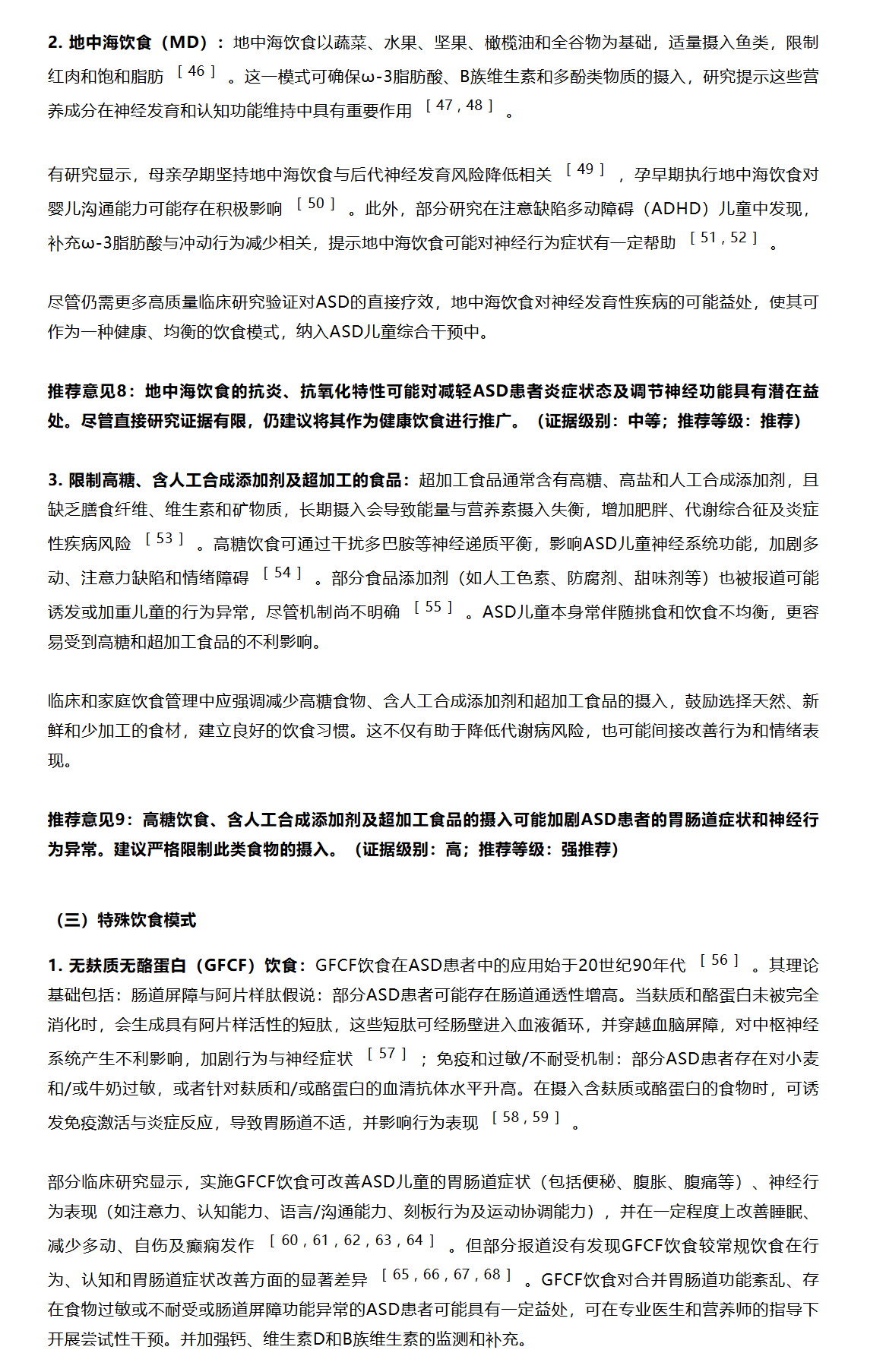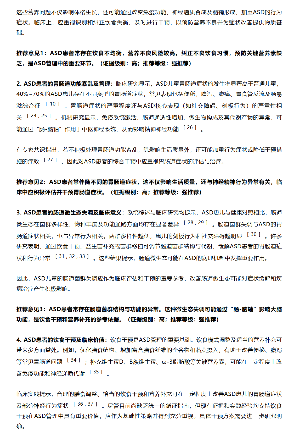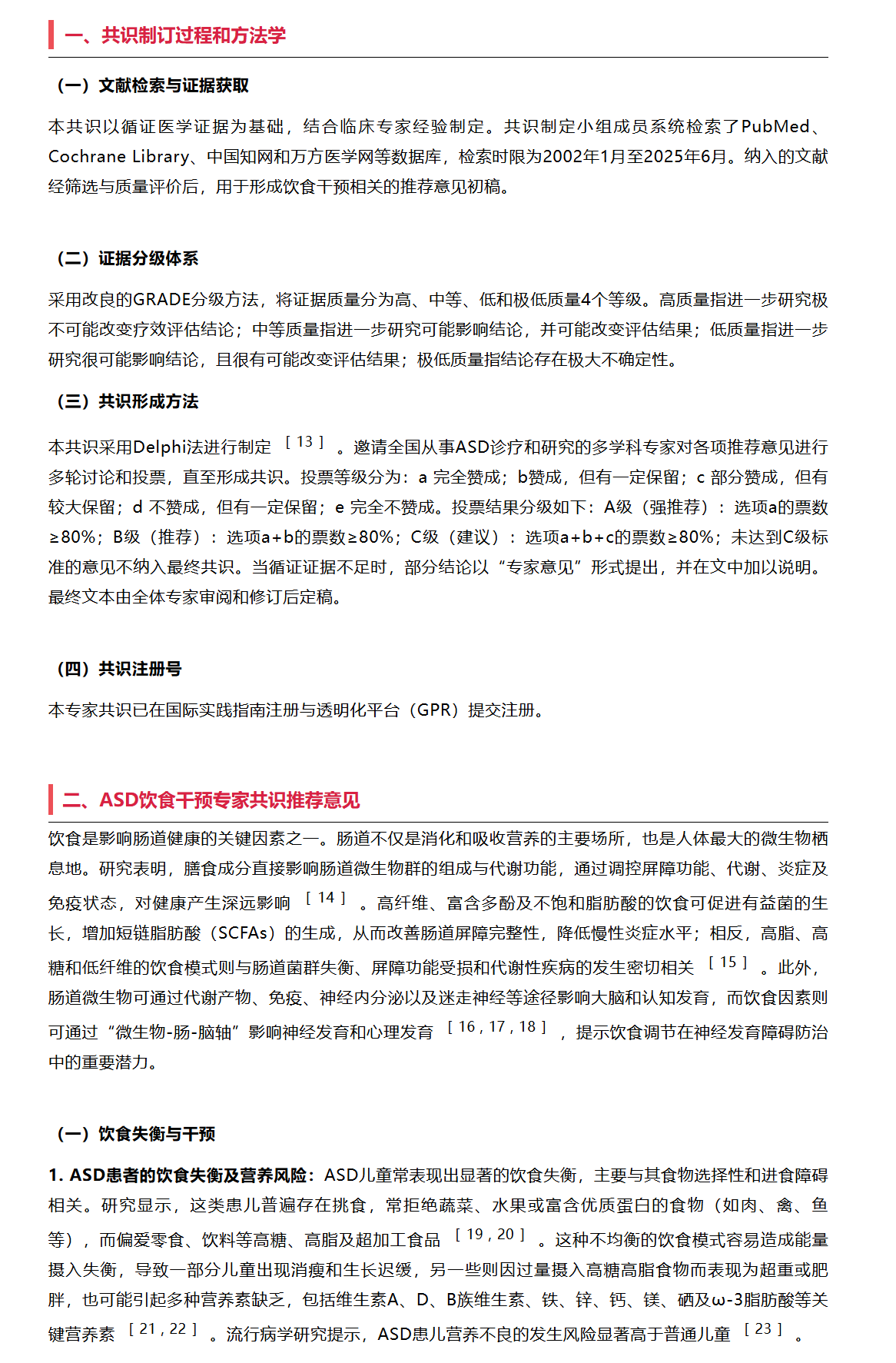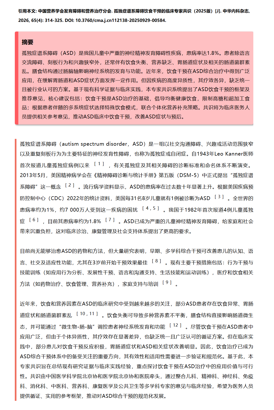 孤独症谱系障碍(ASD)是我国儿童中严重的神经精神发育障碍性疾病,患病率达1.8%。患者除语言交流障碍、刻板行为和兴趣狭窄外,还常伴有饮食失衡、营养缺乏、胃肠道症状及相关的肠道菌群紊乱。膳食结构通过肠脑轴影响神经系统的发育与功能。近年来,饮食干预在ASD综合治疗中得到广泛应用,在缓解胃肠道和ASD症状方面发挥一定作用。但因疾病的高度异质性,其疗效各异,缺乏统一且被行业认可的方案。基于现有科学证据与临床实践,本专家共识系统提出了ASD饮食干预的框架及推荐意见,核心建议包括:饮食干预是ASD治疗的基础,倡导均衡健康饮食,限制高糖和超加工食品;根据患者伴随的多系统症状选择特殊饮食模式,联合个体化营养补充策略。共识将为临床医务人员提供相关参考意见,推动ASD临床中饮食干预,改善ASD症状与预后。
