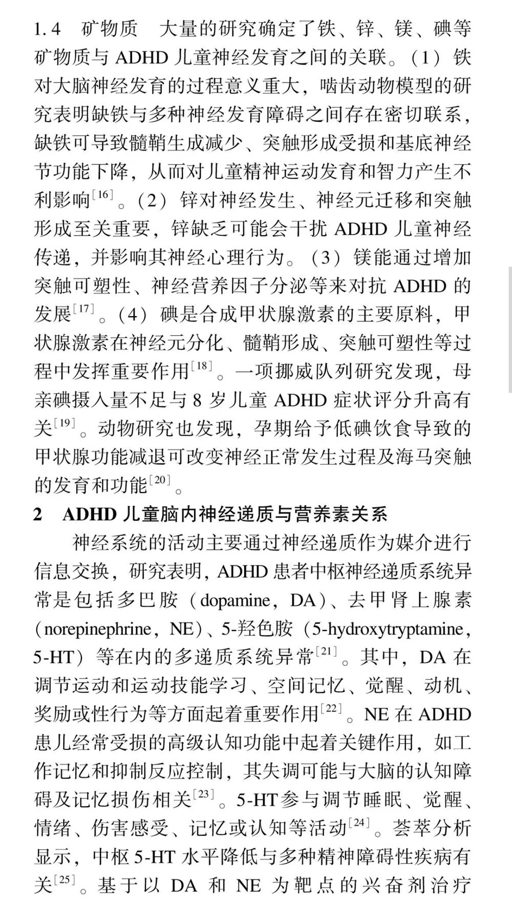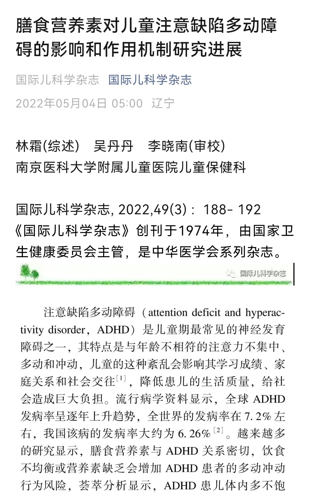 摘要:近年来,在ADHD儿童临床表现的识别、诊断和规范治疗中,营养因素对发病风险的影响越来越受到重视,围绕膳食营养素对儿童ADHD的作用机制也取得了相应进展。本文就膳食营养素在大脑神经发育,神经递质功能、炎症机制以及微生物-肠-脑轴等过程中的作用综述其对儿童 ADHD的影响及相关机制。